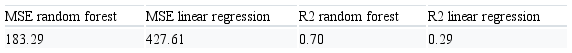 The random forest technique used the same variables of the regression models. Table Xshows the performance indicators for both methodologies. The mean squared error (MSE) of the random forests model (MSE = 183.29) is considerably lower than the MSE of the linear regression model (MSE = 427.61). This is consistent with the comparison using the coefficients of determination. The random forests model has a higher explanatory power for the values observed (0.70) than does the linear regression model (0.29).