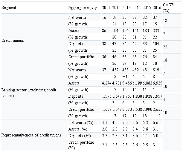 The compound annual growth rate (CAGR) of credit-unions aggregate equity (net worth, assets, deposits and credit portfolio) between 2011 and 2016 was in the range of 18 to 22 per cent. This exceeded the growth rate of other financial institutions. The representativeness of credit unions jumped from 4.1 per cent in 2011 to 6.6 per cent in 2016 of the consolidated banking sector net worth.