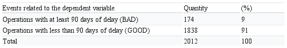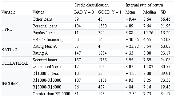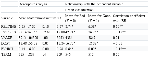 Table IV contains the descriptive analysis of the continuous independent variables. In each line, we present, for each variable, some descriptive statistics, the observed means for bad and good payers and the correlation between the variable and IRR. We used the t-test to compare the means of the independent variables between good and bad payers. Although the normality assumption of t-test is not achieved, the large sample size enables us to carry out the tests. We found significant correlations between IRR and all continuous variables, except for the variables VALUE, DEBT and TERM.