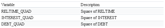 To attenuate problems due to the lack of linearity of the dependent variable and to improve the performance of the ordinary least squares regression model, we added quadratic variables to the set of continuous variables. Table VIII summarizes these variables.