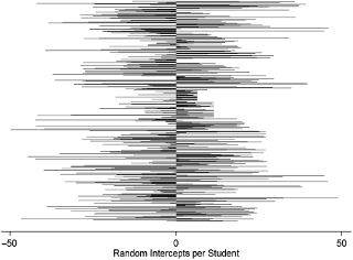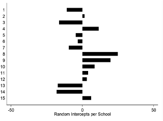 Figures 7 and 8 provide better visualization of the random intercepts per school and per student.