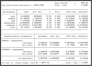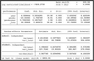 xtmixed performance year gender texp genderyear texpyear ‖ school: year ‖ student: year, var nolog reml estimates store finalindependent