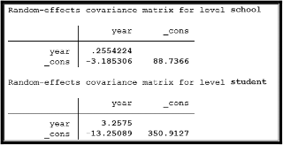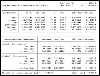 xtmixed performance year gender texp genderyear texpyear ‖ school: year, covariance(unstructured) ‖ student: year, covariance(unstructured) var nolog reml