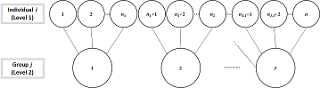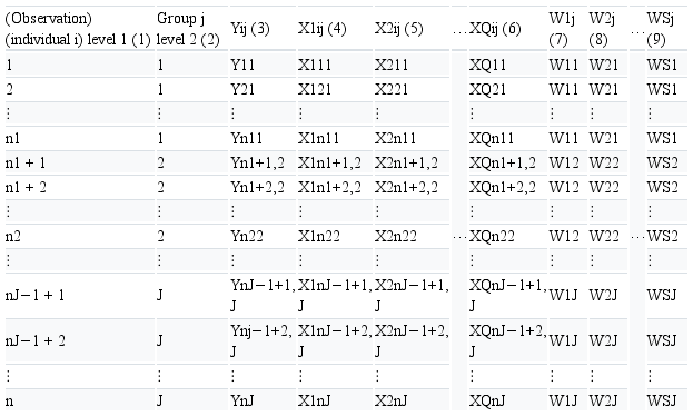 Based on Table I, we can see that X1, …, XQ (columns 4 to 6) are level-1 variables (data change between individuals), and W1, …, WS (columns 7 to 9) are level-2 variables (data change between groups; however, not for the individuals in each group). Furthermore, quantities of individuals in groups 1, 2, …, J (column 2) are equal, respectively, to n1, n2 − n1, …, n − nJ−1 (column 1). Figure 1 shows the existing nesting between the level-1 units (individuals) and the level-2 units (groups), which characterizes the existence of clustered data.
