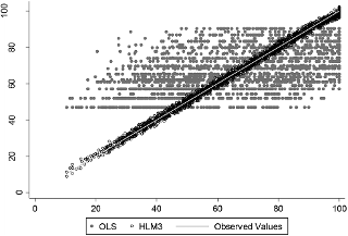 graph twoway scatter yhatreg performance ‖ scatter yhatstudent performance ‖ lfit performance performance ‖, legend(label(1 “OLS”) label(2 “HLM3”) label(3 “Observed Values”))