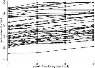 We have a balanced longitudinal data structure since all 610 students are monitored in the four periods. Figure 3 enables us to analyze the temporal evolution of the school performance of the first 50 students in the sample. From the trends in the lines, we can see that the temporal evolutions of the school performance have different intercepts and slopes between students. These different intercepts and slopes justify the use of multilevel modeling and provide reasons to include intercept and slope random effects in Level 2 of the models that will be estimated.