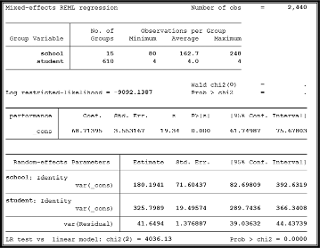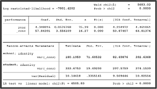Regarding the statistical significance of these variances, the fact that the estimated values of τu000, τr000 and σ² are considerably higher than their respective standard errors suggests that there is significant variation in the annual school performance between students and between schools.