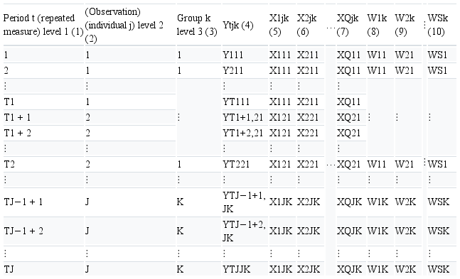Based on Table II, we can now see the variable that corresponds to the period is a level-1 explanatory variable (column 1), since the data change is in each row of the dataset, and that X1, …, XQ (columns 5 to 7) become level-2 variables (data change between individuals, but not for the same individual throughout time), and that W1, …, WS (columns 8 to 10) become level-3 variables (data change between K groups (column 3), but not for the same group throughout time). Furthermore, quantities of periods in which individuals 1, 2, …, J (column 2) are monitored are equal, respectively, to T1, T2 − T1, …, TJ − TJ−1 (column 1).