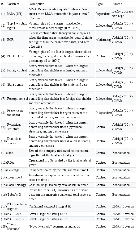 With regard to the limitations, this study considered only the M&A definitions as stated by the Bureau van Dijk database. In this sense, future studies may analyze the effects of ownership structure based on other M&A definitions and typologies. In addition, the study is limited to the period from 1998 to 2007, which is prior to the international financial crisis. Future studies may extend the analysis period to include the post-crisis period (2008) to check if there are differences in M&A strategies before and after the crisis.