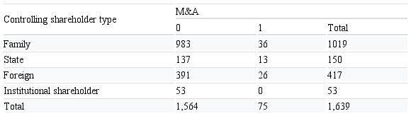Table II shows the behavior of an M&A by controller type. During the analyzed period, the institutional controller did not perform M&A transactions, so this type of shareholder was not considered in the estimated models. In addition, it is interesting to note that out of the 75 transactions observed for these controllers, almost half of them were carried out by family firms.