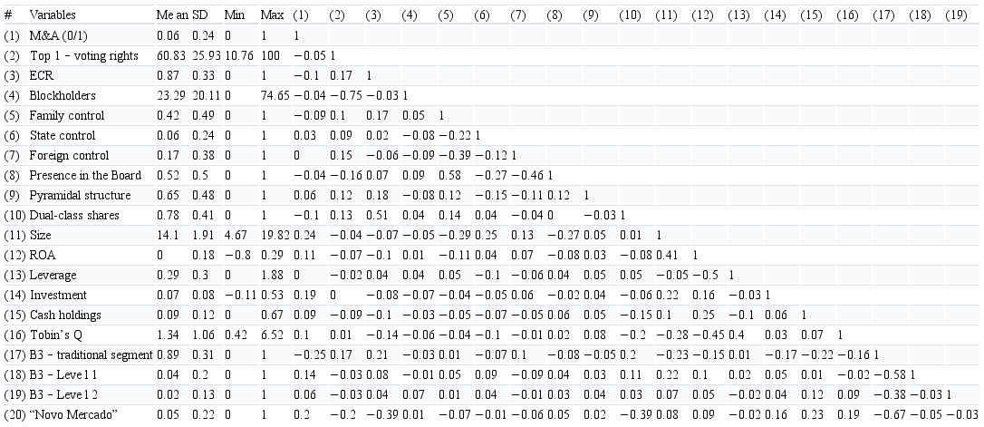 In face of these results, it can be concluded that the concentration of voting rights and the typology of the majority shareholder are relevant corporate mechanisms in M&A decisions. In addition, it is also possible to observe that different types of shareholders carry out different corporate strategies when it comes to a context where there is low protection to external investors, such as it occurs in Brazil.