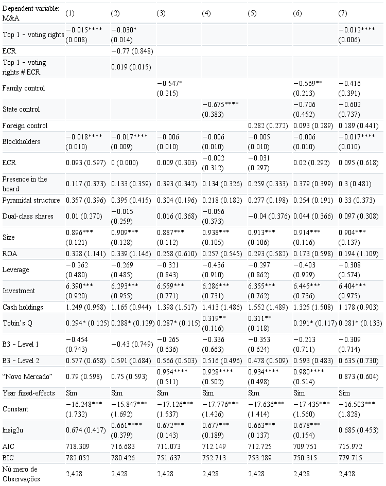 As for the correlations, there is a negative correlation between the variables M&A and TOP 1 (voting rights), which is in agreement with H1. With regard to the correlation between the dependent variable and the controlling shareholder typologies, there is variation, partly indicating that different controllers tend to behave differently when it comes to the M&A decision. On the other hand, the strong correlation between the variables blockholders and voting rights of the majority shareholder suggest the existence of a multicollinearity problem, which would lead to omitting one of these variables if this problem was confirmed. Nonetheless, after performing the variance inflation factor (VIF) test, it was found a value of 1.96, meaning that there is no multicollinearity between the variables and, so the problem regards the level of the variables and not their nature. As a rule, to confirm multicollinearity, the value of the VIF must be > 5 (Corrar, Paulo, & Dias Filho, 2014).