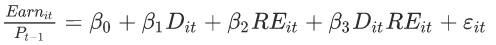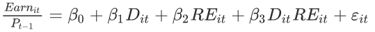 (1)where Earnit denotes earnings per share of firm . in period t,Dit is a dummy variable that takes the value "1" if the economic return is negative and "0" if positive, REit is the economic return of firm i in period t (the economic return is given by Pt - Pt-1) and Pt-1 is the share price at the end of last year.