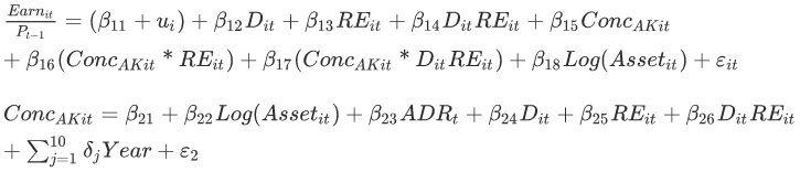 In Eq. (1), referring to the model of Basu (1997), we added the variable ownership concentration ConcAk i,twe added the variable ownership concentration ConcAk i,t, where "k" is the index denotes if the concentration is measured by the percentage of shares owned by the largest shareholder (k = 1) or by the percentage of shares owned by the five largest shareholders (k = 5).