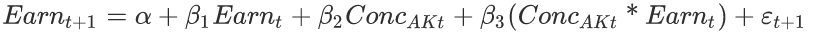 (5)where Earnt+1 is earnings in year t + 1; Earnt is earnings in year t, and the variable ownership concentration is controlled by ConcAkt, where "k" represents the index denoting if the concentration is measured by the percentage of shares owned by the largest shareholder (k = 1) or by the percentage of shares owned by the five largest shareholders (k = 5).