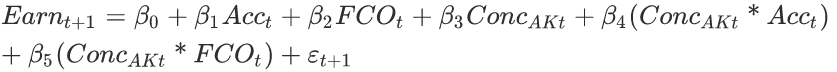 Variables: Earnt+1 is earnings in year t + 1; Acc is the total accruals can be calculated using information from the balance sheet and income statement: TA = (ΔCA - ΔCash) - (ΔCL - ΔSTD - ΔTP) - Dep. ΔCA is the change in current assets; ΔCash is the change in cash and cash equivalents; ΔCL is the change in current liabilities; ΔSTD is the change in debt included in current liabilities; ΔTP is the change in income taxes payable and Dep is depreciation and amortization. CFO cash flow was calculated by the difference of net income and accruals, and the variable ownership concentration is controlled by ConcAkt, where “k” denotes if the concentration is measured by the percentage of shares owned by the largest shareholder (k = 1) or by the percentage of shares owned by the five largest shareholders (k = 5)