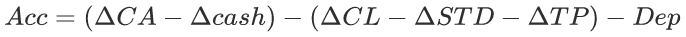 (7)where ΔCA is the change in current assets; ΔCash is the change in cash and cash equivalents; ΔCL is the change in current liabilities; ΔSTD is the change in debt included in current liabilities; ΔTP is the change in income taxes payable and Dep is depreciation and amortization.