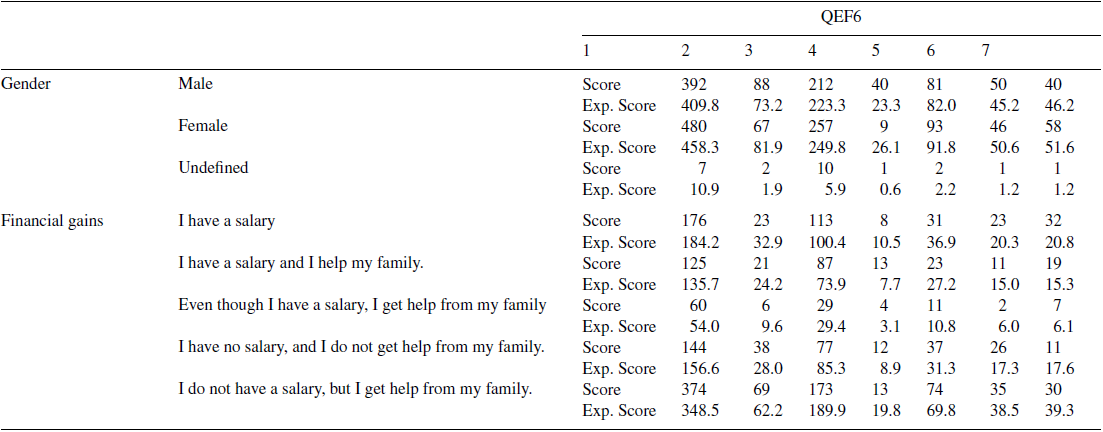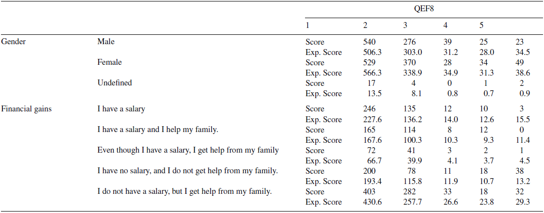 The Kruskal–Wallis test was applied to the individual, demographic and socialization aspects of ordinal order (QAP1, QAP2, QAP3, QAP4), and on financial education questions of nominal order (QEF1, QEF2, QEF3, QEF4, QEF5, QEF6, QEF7, QEF8). As Fávero, Belfiore, Silva, and Chan (2009, p. 176) states, "the Kruskall-Wallis test checks out the probability that "k" independent samples are from the same population. The variable used in the test should be measured in a quantitative or ordinal scale."