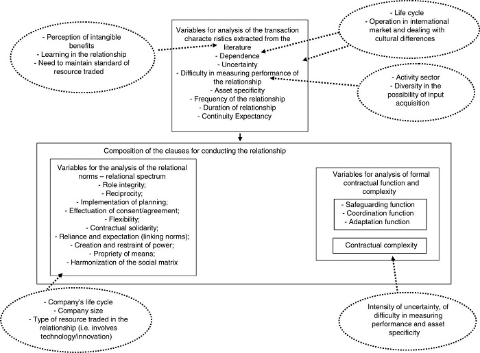 In Fig. 2, the illustration which represents the model proposed is presented, considering the items explored in the data analysis. The dotted illustration represents the explored factors which may alter the variables that form the transaction characteristics and the formal and relational contractual governance structures reviewed in the literature.