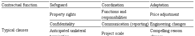 In this respect, Mallewigt et al. (2012) argue that the performance of inter-organizational relationships is not only affected by the number of contractual clauses (i.e. contractual complexity), but also by the content which specifies the functions of the contracts. From the model proposed by the authors, the clauses considered typical of the safeguard function are those related to ownership rights, confidentiality, anticipated unilateral termination, and dispute resolution. On the other hand, the coordination function would involve the presence of clauses addressing functions and responsibilities, communication (i.e. reporting), project scale, and the appointment of specific staff. Finally, the adaptation would lead to the presence of clauses of price adjustment, engineering changes, and compelling reason clauses.