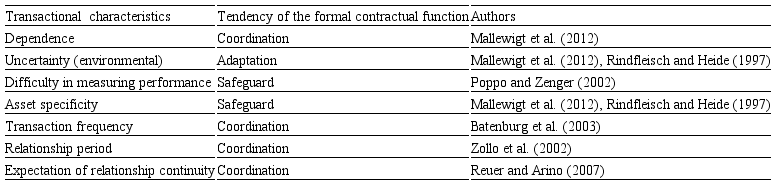 In order to corroborate, Arino and Reuer (2004) argue that empirical evidence suggests a significant contractual heterogeneity in hybrid arrangements, and the transaction characteristics are determinant of the contractual complexity and governance form. The authors also highlight that, in the context in which the parties have already had previous experience with each other, the relationship can be maintained with less use of complex formal contracts, since uncertainty about the other party's behavior is reduced. Table 2 summarizes the relationships between the contractual function and the transaction characteristics observed in the literature.