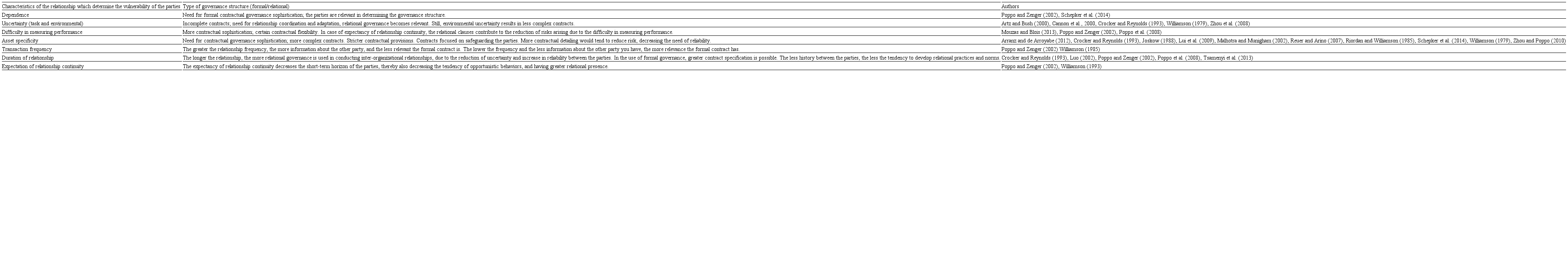 Besides the transactional characteristics considered in the TCE, the literature on inter-organizational relationships points to others that possibly influence the composition of governance structure, namely: dependence, difficulty in measuring performance, relationship period, and the expectation of continuity of the relationship (Artz & Bush, 2000; Crocker & Reynolds, 1993; Poppo & Zenger, 2002; Schepker et al., 2014; Williamson, 1979, 1993; Zhou et al., 2008). Next, these characteristics and corresponding governance structures are reviewed.