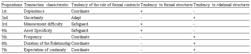 Knowing that the characteristics presented generate different risks to the organizations of not reaching the intended results, different governance structures that may vary from discrete to relational, using formal contracts or not, are demanded for the conduct of the relationships, as explained in Table 3, and each characteristic of the transactions is detailed next (Dekker, Sakaguchi, & Kawai, 2013; Hatten, James, Fink, & Keeler, 2012).