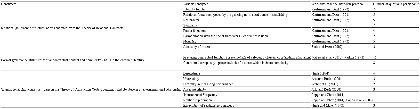 Intending to obtain greater inner reliability in an exploratory study, it was decided to (i) elaborate an interview script from the structure of data collection already tested in papers published in the field; (ii) use more than two questions for each variable (except the "relationship duration" and "transaction frequency" variables); (iii) carry out the interview with six companies which have different transactional characteristics in the relationship, enabling case comparison; and (iv) collect data about the formal contractual content by means of interviews, and paper documents in the relationships which used formal contracts.