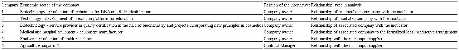 In order to apply the technique of Content Analysis, six managers were interviewed in August and September of 2015. Three interviews described the contractual governance analysis of the incubated companies at different stages; another, the governance between a company within a formal conglomerate of companies and the conglomerate as a whole; another, the governance of a footwear company's relationship with its leather suppliers, both members of the same non-formalized conglomerate; and finally, the relationship between a sugar mill and its sugar cane suppliers. The recorded interviews lasted 45, 74, 57, 62, and 77 min, respectively (Table 6).