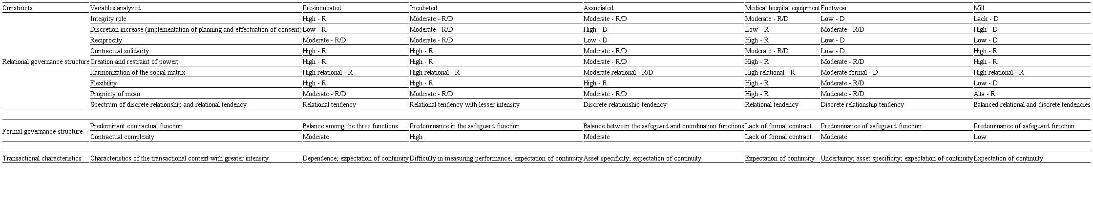 Once the procedure described above was carried out, the profile of the relationships studied for the three analysis constructs was configured, considering the intensity (i.e. high, average, low) of the presence of the variables. After each variable that represents the transaction characteristics had been analyzed, the ones which had greater intensity in the transaction, i.e. which are present in the analysis relationship context, were allocated in the table.