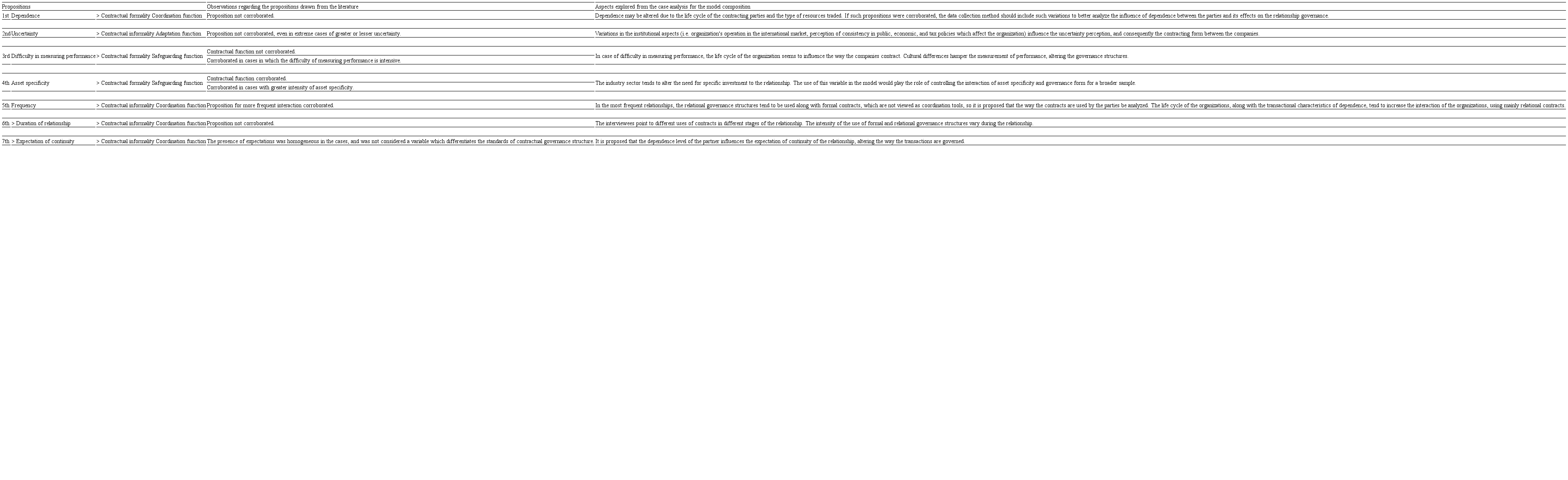 Finally, the formal contractual complexity, assessed in terms of intensity (i.e. high, average, low), was analyzed by the number of contractual clauses present, according to the model proposed by Parkhe (1993). The role played by formal contracts in the relationship was observed from the presence or lack of typical provisions of the contractual functions of safeguarding, coordinating, and adapting (Mallewigt et al., 2012) embedded in the contracts, enabling analysis of the predominant functions in the relationships. After the exploration and data interpretation stages had been fulfilled, a table of the summary of the analyses was developed. The results for each proposition are described next and presented in Table 7.