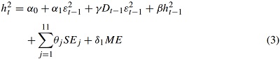 Two types of external effects are incorporated into the variance equation: seasonality and time-to-maturity. The seasonality effect is included using three variables SEj for quarters of the year: SE1 equals 1 for January, February, and March, and 0 otherwise; SE2 equals 1 for April, May, and June, and 0 otherwise; SE3 equals 1 for July, August, and September, and 0 otherwise. The maturity effect is expressed by the variable ME and should be negatively related to the commodity price volatility, since price variability tends to increase as the maturity date approaches.