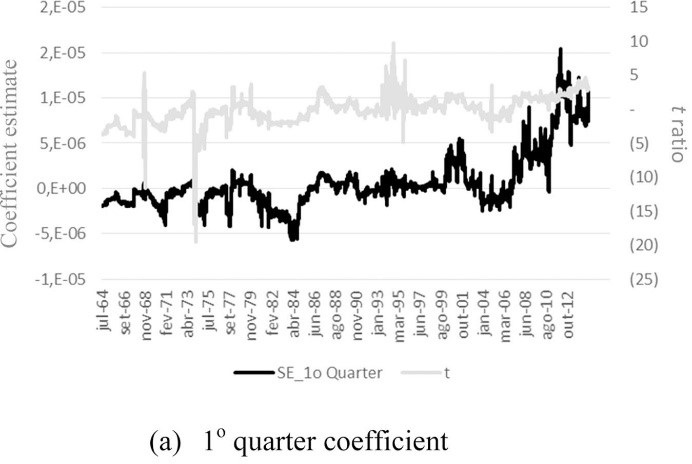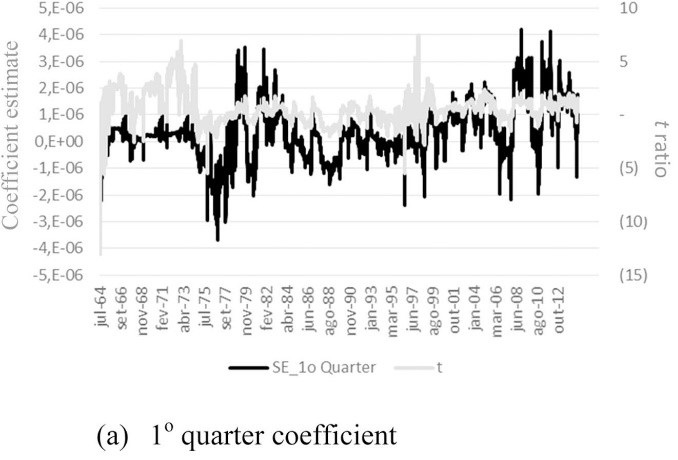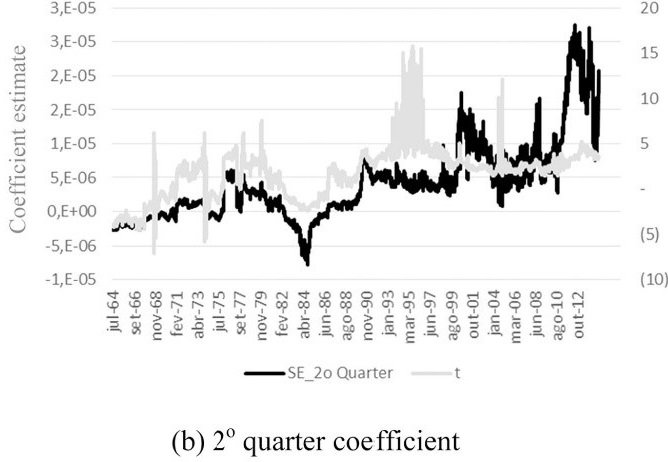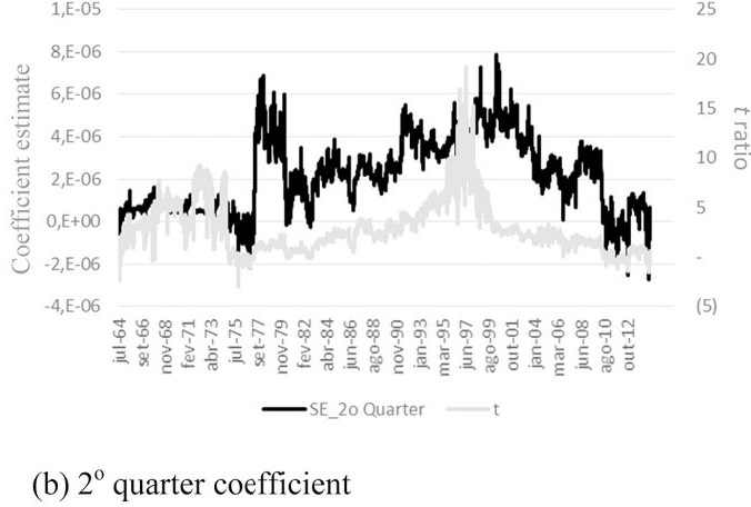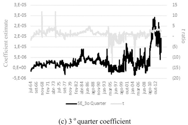 Overall, results suggest changes in the estimated parameters. In both markets, we can verify a slightly lower short-run persistence (ε2t−1) and a slightly higher asymmetric effect (D.−1ε2t−1), particularly between 2005 and 2014. Furthermore, there is evidence of maturity and seasonality effects. Rolling coefficient estimates, which are discussed as follows, provide a more comprehensive analysis of these issues and shed more light on the analysis.