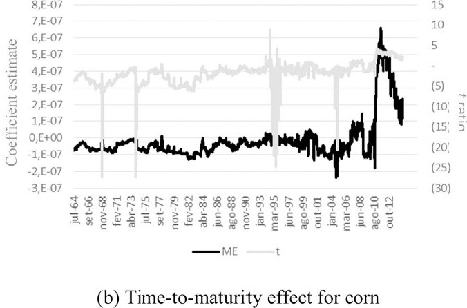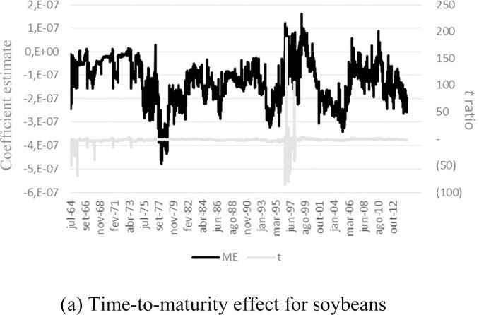 Furthermore, Appendices A–C present the rolling coefficient estimates for seasonality and time-to-maturity effects for the soybean and corn markets. Results point to the existence of greater volatility during the planting period and before the harvest in the U.S. (second and third quarters). The evolution of time-to-maturity coefficient indicates higher futures price variability when the futures contract approaches its expiration for both markets.