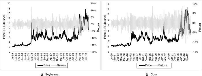 Volatility series for soybeans and corn are obtained through the estimation of the TARCH model (Eq. (3)). Results indicate the existence of volatility clusters for corn and soybean returns. In both markets, annual volatility generally ranges between 10% and 50%. In addition, the three most relevant breaks in price volatility common to corn and soybeans occurred at the end of Bretton Woods system (1973), the largest production shortfall in the U.S. grain markets in 1988, and during the subprime crisis in 2008. During these periods, the volatility in grain markets exceeded 60% a.a (Fig. 2).