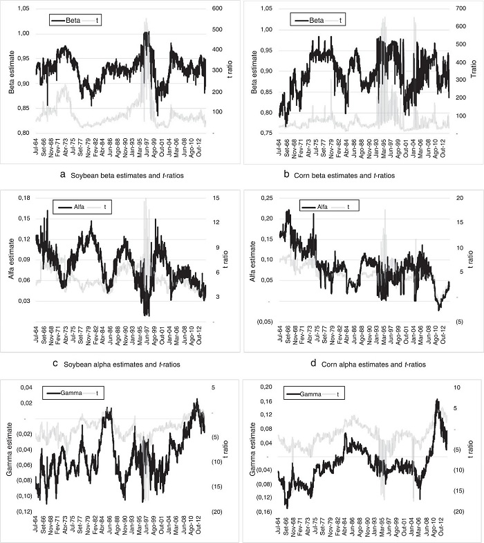 Fig. 3 shows the evolution of rolling .1, . and . coefficient estimates with a rolling window of 1008 observations for corn and soybeans and their corresponding .-ratios from July 1963 to December 2014. In general, rolling . coefficient estimates for corn and soybean models are in the 0.8–1.0 range and are statistically distinguishable from zero, which indicates greater long-run shock persistence. For corn, . coefficient estimates present lower levels and higher instability than the respective soybean parameter (Table 5).