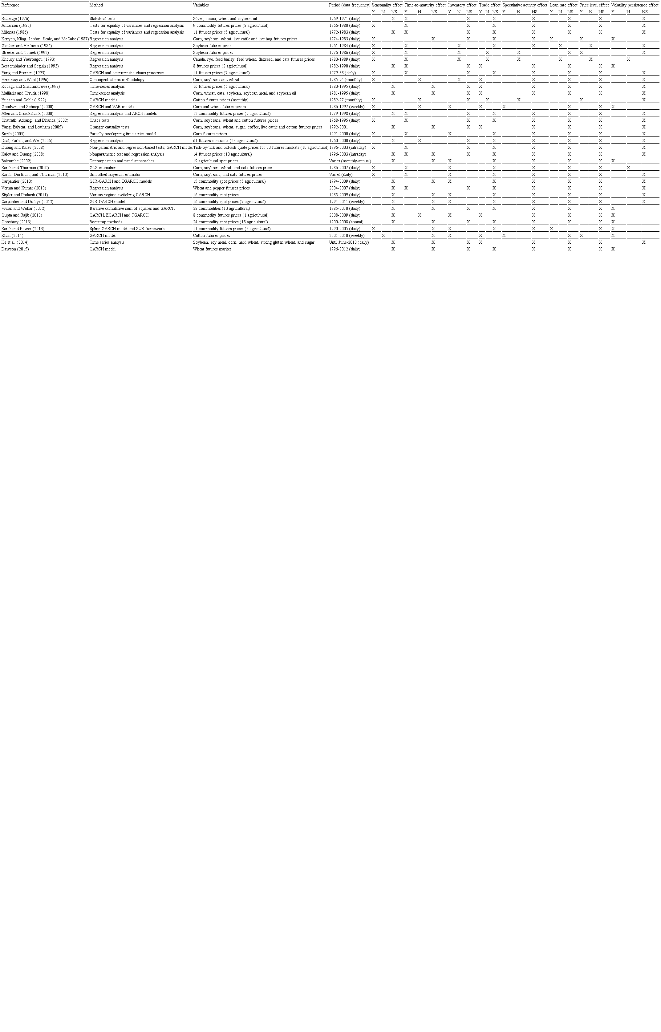 In addition, a fourth group of studies analyzed the determinants of agricultural commodity price volatility. Seasonality, time-to-maturity,[2] inventory level, volatility persistence, day-of-the-week, futures market trading volume, speculative activity, loan rate level, price level, among others, were analyzed in order to verify their influence on agricultural commodity price fluctuation. Table 1 present a summary of this literature and the following paragraphs address the recent studies.