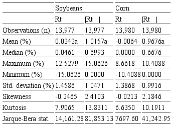 Descriptive statistics for corn and soybean returns are given in Table 2. Mean returns (Rt) of corn are not statistically distinguishable from zero. Mean absolute returns (|Rt|) are in the 0.96–1.02% range and are also statistically distinguishable from zero. A similar volatility in the soybean and corn futures market can be observed. Soybean returns have a daily standard deviation of 1.46% per day (23.15% per year), while corn shows 1.39% per day (22.01% per year). In addition, regarding the return series, there is no evidence of skewness, however, the distributions of absolute returns appear to be positively skewed. There is also evidence of excess kurtosis for both series. Finally, Jarque–Bera tests suggest nonnormality in all series, supporting findings given by previous studies (Isengildina et al., 2006; Karali, 2012).