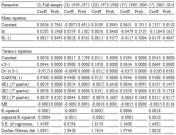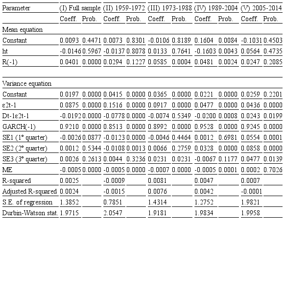 In addition, in the variance equation, the model shows high volatility persistence. For the years 1959–2014, the half-life period is 630 days, indicating a very slow adjustment process. Regarding the split periods, the models show a half-life of 19 days for 1959–1972, 54 days for 1973–1988, 73 days for 1989–2004, and 35 days for 2005–2014.