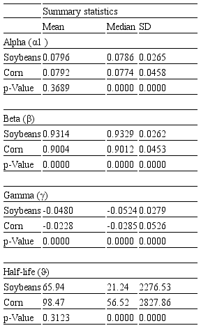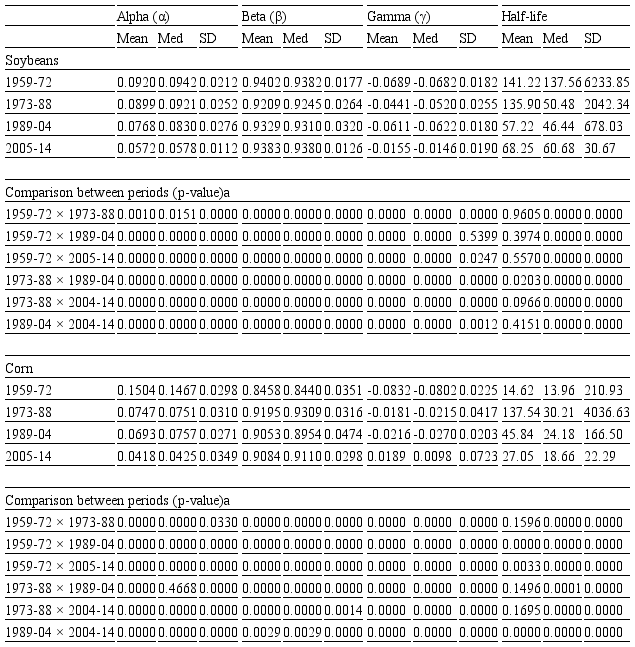 Table 6 shows the descriptive statistics for rolling .1, . and . coefficient estimates for each separate period. The findings confirm previous results related to lower . estimates over the last two periods, resulting in a decrease in the importance of short-run volatility persistence in soybean and corn markets. Consequently, it can be largely verified that the long-run persistence (.1 + ./2 + .) and half-life period tend to be lower in the recent period, especially during 2005–2014, despite increasing values for ..