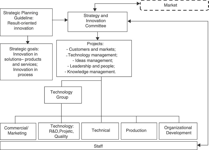Fig. 2 shows that in order to meet the guideline and the strategic aims of innovation, the Committee works to identify and interpret market signs, as well as capture, in a systematic manner, the ideas proposed by employees. All selected signs and ideas are classified into five dimensions for the development of projects: consumers and markets, technology management, ideas, leadership, and people and knowledge management. After classification, these requests are transferred to the technology group, which allocates tasks, according to the required competencies, to implement the project.