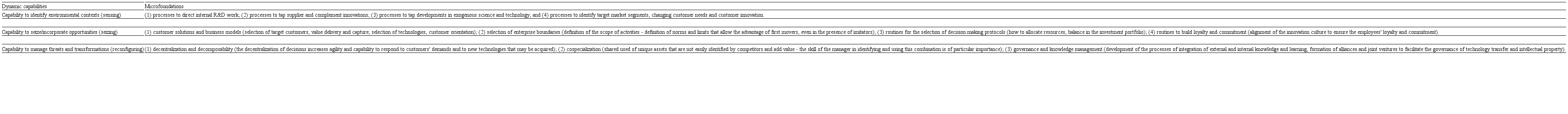 These dynamic capabilities are supported by microfoundations, an extremely relevant concept in this context, given that they refer to routines and processes that will allow the implementation of dynamic capabilities. Teece (2007) emphasizes the importance of distinguishing between these concepts because different processes in a company can represent important elements for dynamic capabilities. In other words, equal routines and processes in different companies may or may not become dynamic capabilities facilitators. These processes and routines are the elements that can sustain innovation in a competitive environment to increase a company's competitive advantage over time (Day & Schoemaker, 2016; Pasian et al., 2012; Teece et al., 2016). Table 1 presents the dynamic capabilities and its microfoundations.