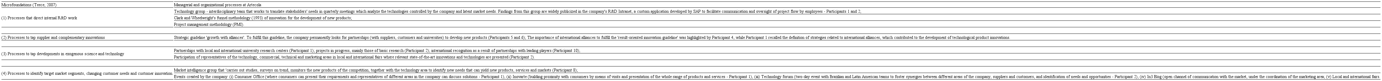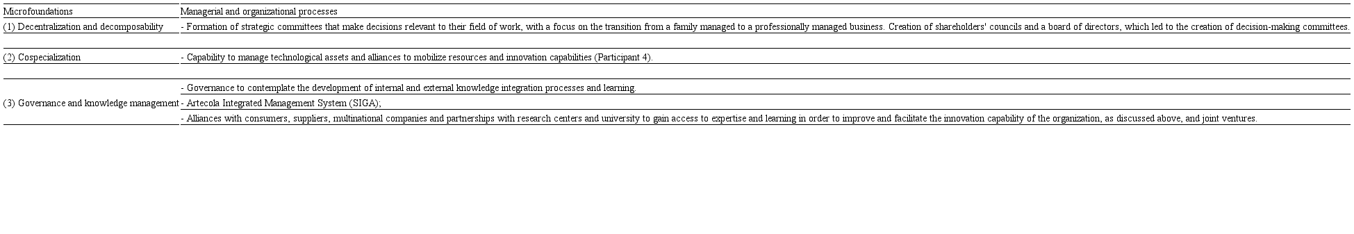 Thus, the aim of this section, which dealt with data description and analysis, was to present each of the dynamic capabilities and their respective microfoundations, as proposed by Teece (2007). It can be observed that these capabilities contributed to the development of the innovation capability at Artecola through the creation of managerial and organizational processes.