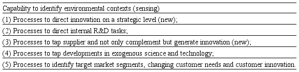 For this reason, it was important to add a new microfoundation to the sensing capability, which in this study was defined as ‘processes to manage innovation on a strategic level'. This microfoundation was not identified by Teece (2007), but was based on the empirical data collected, which showed these to be an essential element in the conception and dissemination of innovation strategies. This microfoundation spurs the process of translating strategies into innovative actions.