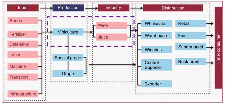 Figure 2, in general, is the systematization of the supply chain of the grape and / or wine, due to their inter relationships. According to Garcia Filho (1999)regarding the establishment of the agricultural production system, it can be defined as a combination (in time and space) of resources available for obtaining the crops and animals. A production process is a system of actions that are interrelated dynamically and are geared towards the transformation of certain elements. Thus, the input elements, the grapes, become output elements, the wine, following a process of value added.