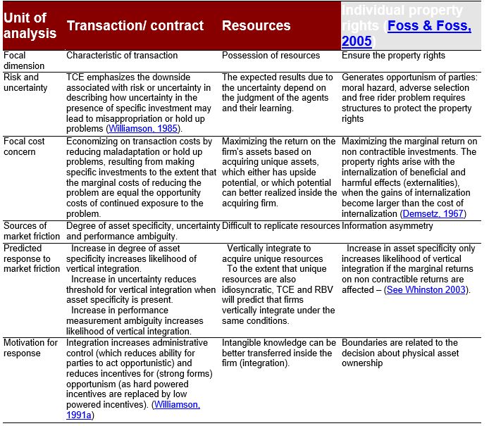 In this section we argue that each of the three theories Transaction Cost Economics; Resource Based View; Property Rights gives an incomplete picture of the factors affecting firms' governance decisions when taking in isolation. Some authors' contributions concerned the comparison, complementarity or possible integration between the theories. Particularly, with regard to transaction costs, there are studies that explore the possibilities of integration with capabilities/resources (Williamson, 1999.Jacobides & Winter, 2005; Argyres & Bigelow, 2008. Argyres & Zenger, 2012). As we will explain below, in some situations each of the three theories will predict a different governance decision, while in other situations the theories will predict the same governance decision, but for different reasons. Jointly considering all three theoretical perspectives when analyzing firms' governance decisions will therefore help researchers to better predict what governance forms firms use in specific situations and why.