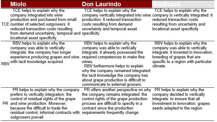 The Don Laurindo case showed that, asWilliamson (1999) observed, the TCE and RBV perspectives are complementary. While a TCE perspective help to explain why Don Laurindo vertically integrated into wine production, a RBV perspective explains why the company was in a position to do so. Furthermore, both perspectives combine well with the Property Rights (PR) perspective in this case. PR helps to explain why Don Laurindo remains fully vertically integrated; i.e., it sheds light on why the winery part of the company does not procure grapes (also) from external grape grower.