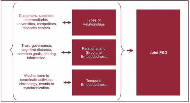 Managing collaborative projects with different actors is a task of significant complexity (Coussi et al., 2015). The complex nature of R&D in industry is associated with very different activities, including: innovation in concepts and ideas, the joint creation of knowledge (Connel, Kriz & Thorpe, 2014), the complementarity of knowledge between specialized fields (Lopez & Esteves, 2013) the definition of new scientific questions and hypotheses (Todeva, 2006). Jones and Lichtenstein (2008), in addition to Saenz and Perez-Bouvier (2014), note that studies in the organizational literature have very rarely considered how multiple actors coordinate their collaborative efforts and that they have also seldom considered how the expectation of limited duration modifies their interactions. The shapes of both social and temporal Embeddedness can end up affecting the complex activities related to the management of inter-organizational projects (Jones & Lichtenstein, 2008). Thus, for a better understanding of the effect of collaboration on innovation, not only the scale and density of the cooperation agreement but also the depth of such networks (in terms of the types of employed agreements: short-term versus long-term or a combination of both) and their operational performance (i.e., the proper functioning of the network in terms of planning, working methods, commitment, monitoring and evaluation) must be analyzed (Saenz & Perez-Bouvier, 2014).