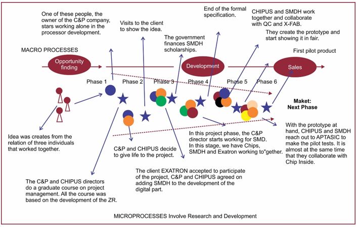 The second stage consisted of selecting the necessary respondents to make the description of the experiences of the case of the ZR16 chip and the definition of the data collection techniques that would be used. We chose to focus on the collection of data in three DHs (Design Houses): SMDH, CHIPUS and C&P. This selection was made because the project had been designed for them. It should be noted that they are also the holders of the patent that led to the microcontroller. Thus, we conducted an in-person interview with the CTO of the Santa Maria Design House (SMDH). This interview occurred December 7, 2012; it lasted 1 hour and 35 minutes, and its transcript was 17 pages. This respondent also replied to a questionnaire on the general characteristics of the company, the number of employees, designs, patents, investments, partners and the benefits from collaborative partnerships.