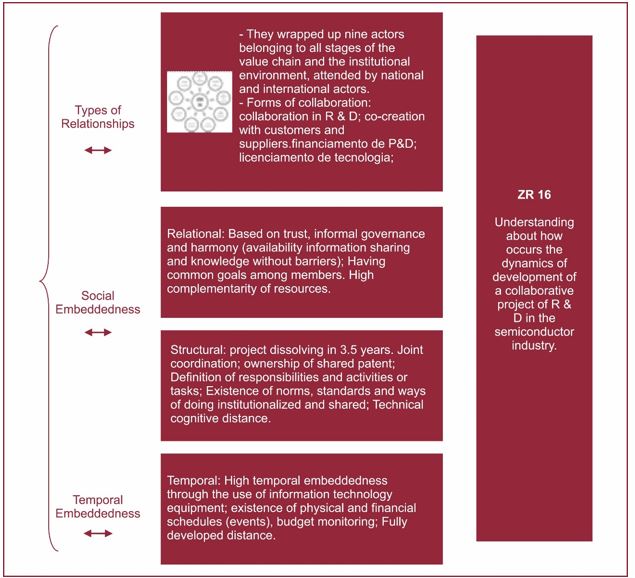 Unlike other projects in which there is a single leader or a group of organizations (Jones & Lichtenstein, 2008), here, the coordination of the project was overseen by the product patent holders. Regarding the idea of the design phase, the Embeddedness with the client was fundamental; that is, with these three actors, relational Embeddedness tended to be very strong due to the frequent repetition of the interactions during the project duration. Differently, with the other actors, this interaction was not as frequent and was restricted to the stage in which only the collaboration was necessary, with a tendency not to be as recurrent in the development of the ZR16 chip.